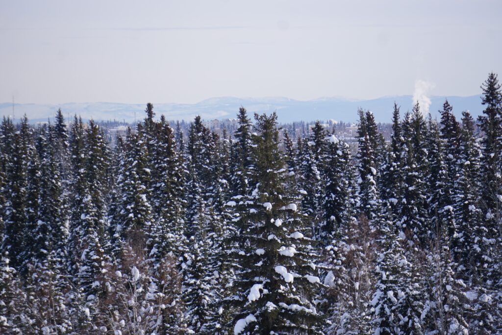 Smokestack emissions into Fairbanks’ atmosphere are seen on March 1, 2023, from the University…